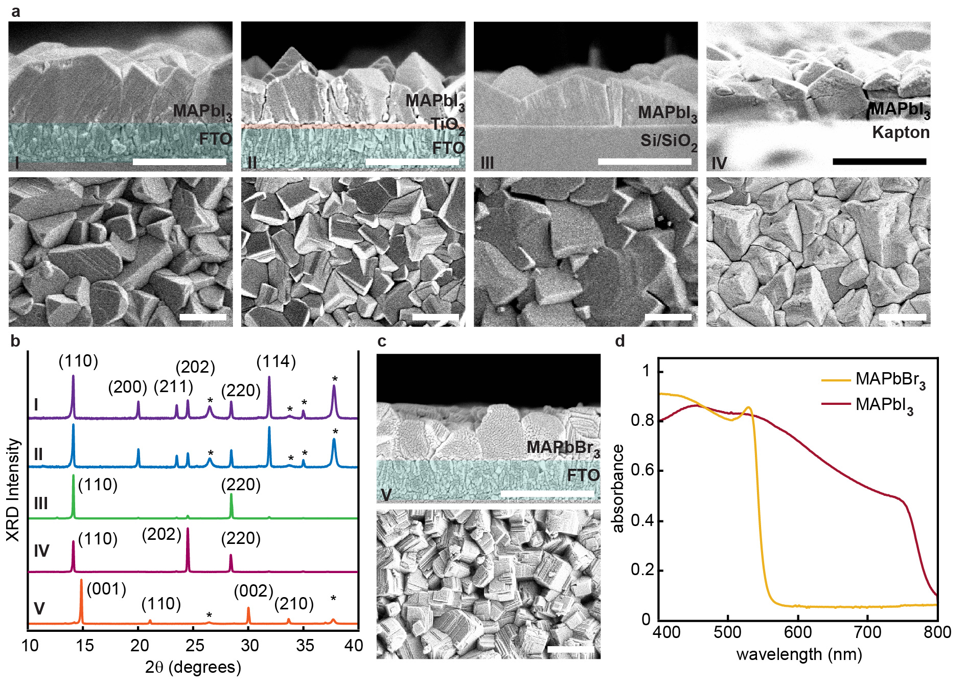 We have successfully deposited continuous thin films of MAPbX3 (X=I, Br) perovskites on various substrates including transparent conductive oxides, silicon oxide, and flexible polymer substrates (see figure). We’ve also used DFT molecular modeling to probe the mechanisms governing these vapor-phase reactions. We expect further MOCVD process development will unlock unprecedented compositional, crystallographic, and morphological control, enabling the precise design of material properties and pursuit of new applications